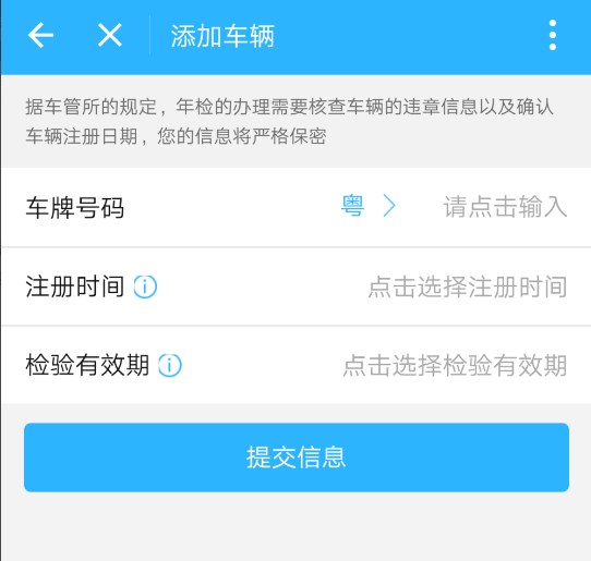 6、在弹出页面中输入车牌号码、注册时间及检验有效期,完成后直接点击“提交信息”即可,之后每到年审前,支付宝都会有相关提示。