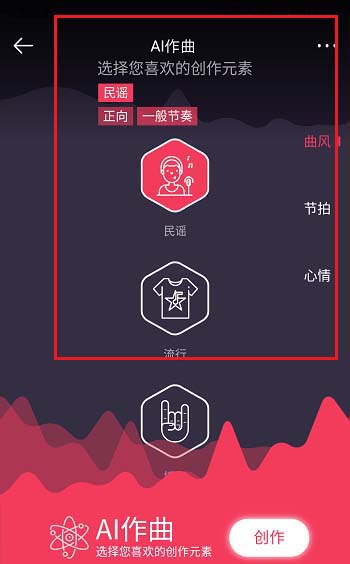 3、我们点击AI作曲进去,选择好曲风,节拍和心情点击创作,如下图所示: