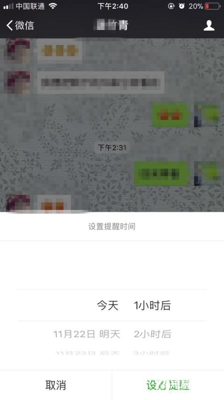 一、首先进入到聊天对话界面,选择聊天内容,长按这个信息即可出现“提醒”一栏,这个提醒是和复制、转发、收藏等并列出现的,如图所示。