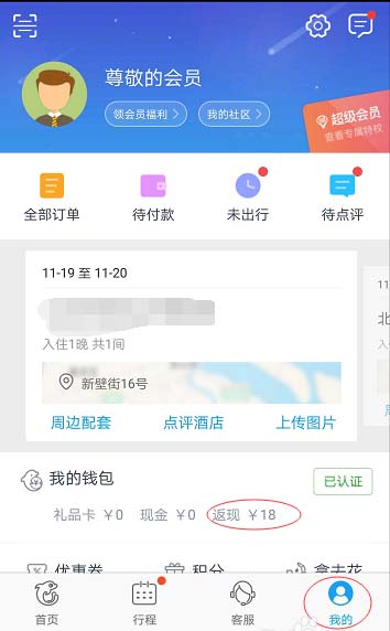 1、首先先正常登录携程APP,并成功预定酒店,点击“我的”,查看“我的钱包”,在返现中金额不为0,如下截图所示。