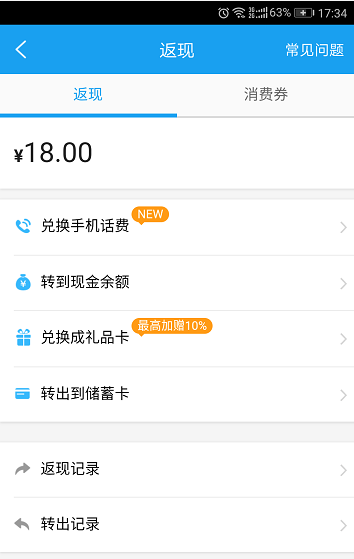2、点击“返现”,页面将跳转如下截图,可以查看目前帐号上的返现金额是18元。