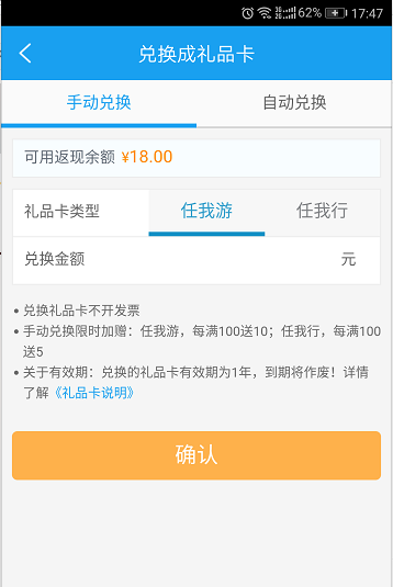 第四种:是可以兑换成携程的礼品卡,这种比较划算,在原有额度的基础上,还能增加10%,前提必须是返现的金额达到100元以上。礼品卡可以用来购买携程商城上的东西和预定酒店使用。