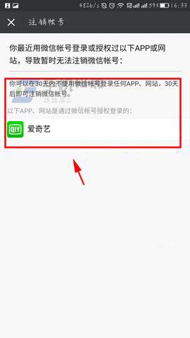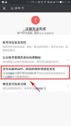 3)进入到注销界面后我们再点击【申请注销】,然后就会出现提示注销无法完成,我们点击下面的【存在与其他APP、网站的授权或绑定关系】选项。(如下图)