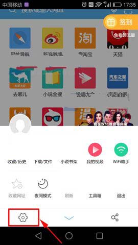 1)打开UC浏览器后,点击下面的【三】进入到设置菜单,弹出二级菜单后再点击左下角的【齿轮】进入设置。(如下图)