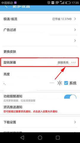 2)来到设置界面中找到【旋转屏幕】点击右边的【三个点】;然后会出现三个选择【跟随系统】、【锁定横屏】、【锁定竖屏】,您可根据的自己的情况选择即可。(如下图)