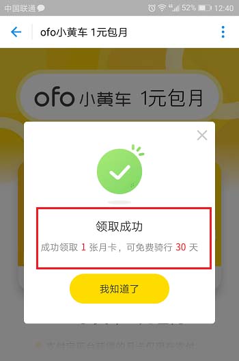 6、我们领取月卡之后,就可以进行骑行的界面了,需要注意的是领取的月卡只在该软件使用共享单车有效,如下图所示: