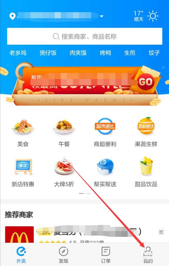 2、在打开的饿了么首界面里直接点击右下角的【我的】,如下图所示。
