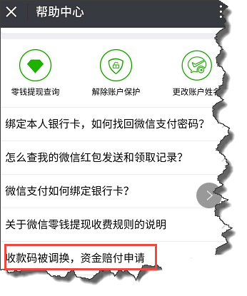 7、在帮助中心,点击“收款码被调换,资金赔付申请”