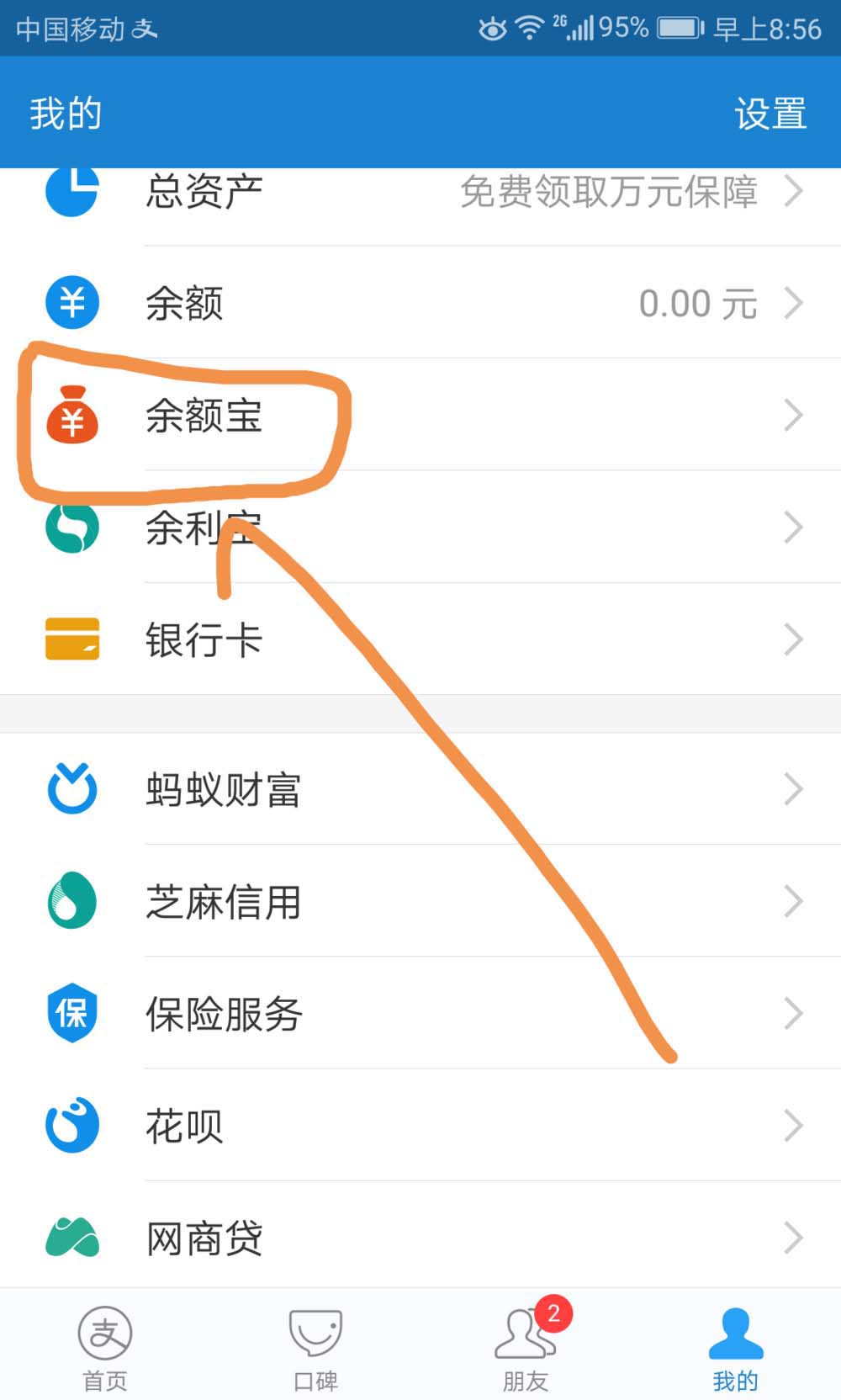 2、进入支付宝之后点按界面下方的我的标志,然后点按上方的余额宝标志,如下图所示。