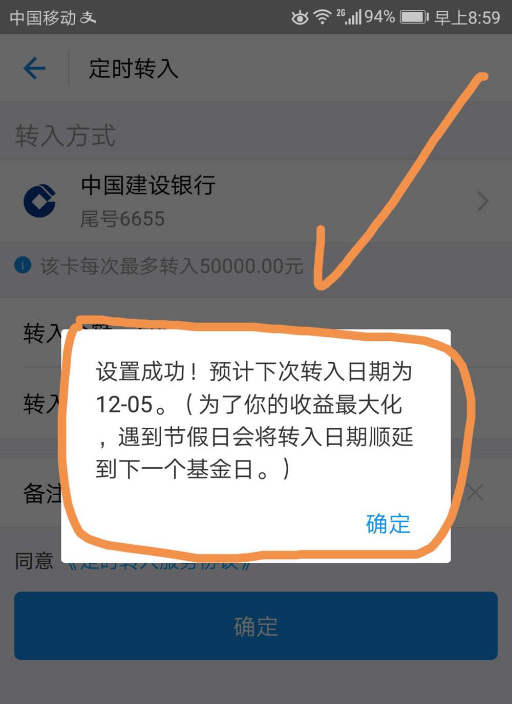 4、此时转入定时转入界面,在转入方式中可以使用默认的银行卡,如果默认的银行卡不是工资卡,需要点选箭头指向的位置。