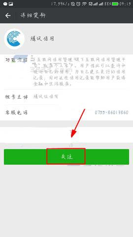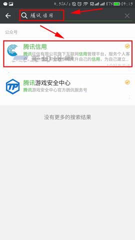 2)然后在搜索栏中输入【腾讯信用】进行搜索,接着点击进入腾讯信用的公众号,接着我们在点击【关注】该公众号。(如下图)