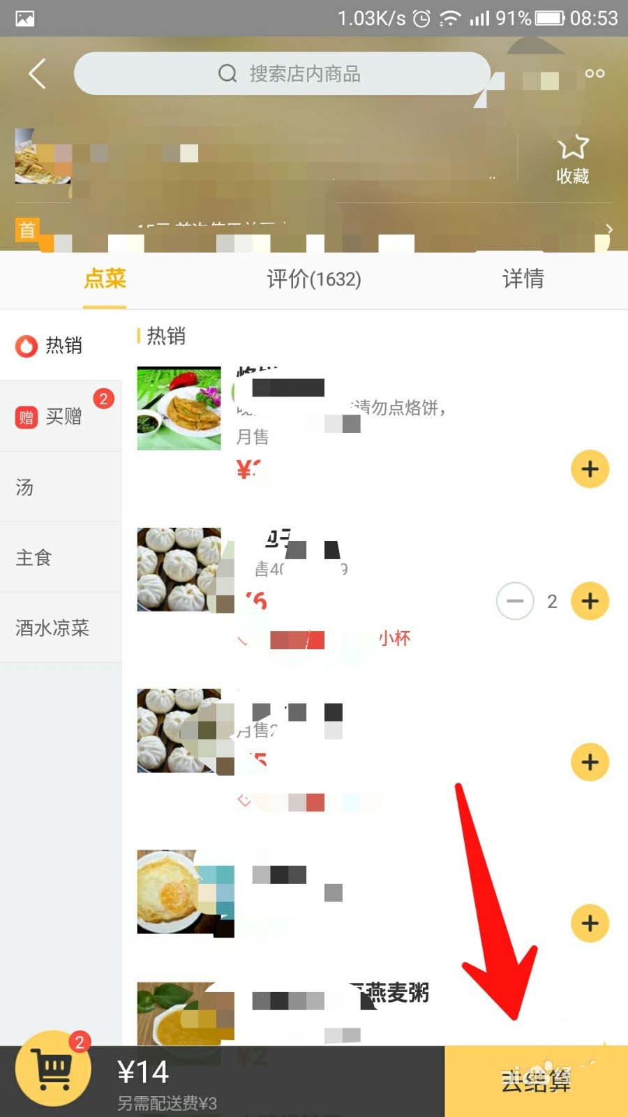 2、选择你想要吃的美食,添加购物车之后,点击图示位置右下角“去结算”。