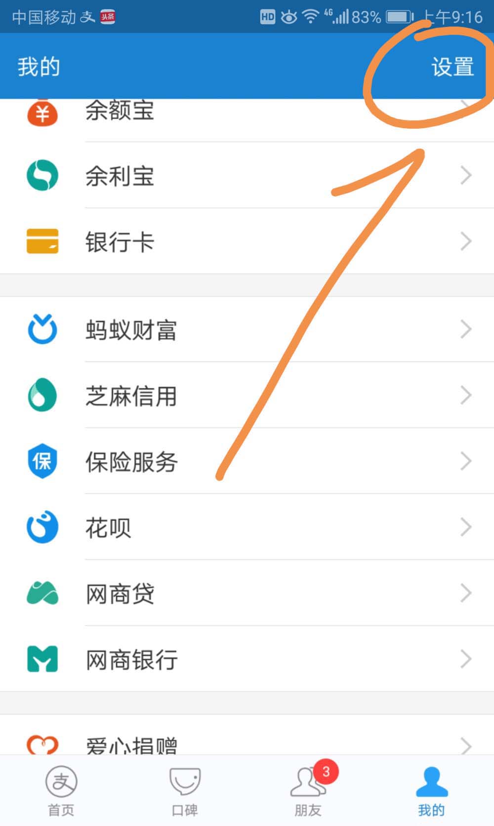 3、在我的界面点按界面上方箭头指向的设置标志。