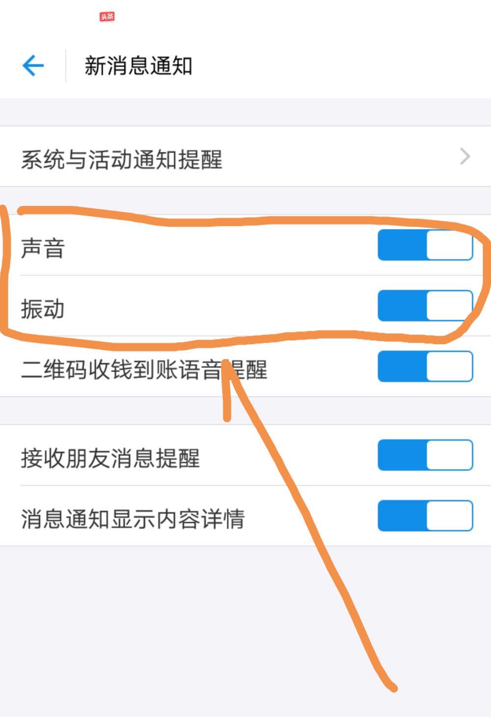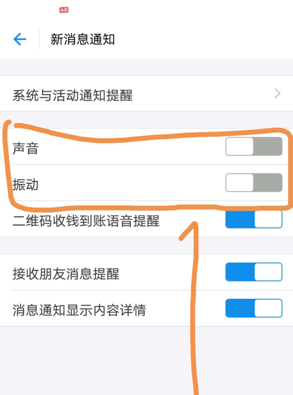 7、点按完后可以看到声音与震动后面的开关标志已经关闭了,此时支付宝群消息将不会再产生声音或者震动提醒。