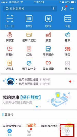 2、在支付宝首页点击右下角的“我的”页面切换按钮