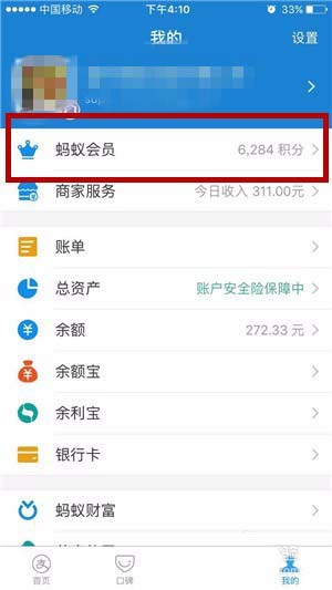 3、进入“我的”页面后,点击头像下方的“蚂蚁会员”按钮