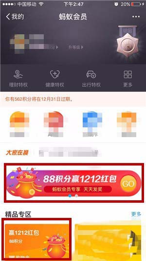 4、在“蚂蚁会员”页面中,我们可以看到目前正在推广的赢1212红包活动海报;还可以在“精品专区”中看到海报。我们点击一下