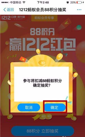 6、在弹出的扣除88蚂蚁积分的对话窗口中,点击“确定”。首先小伙伴们要确保自己又88积分,不然还真无法完成抽奖。