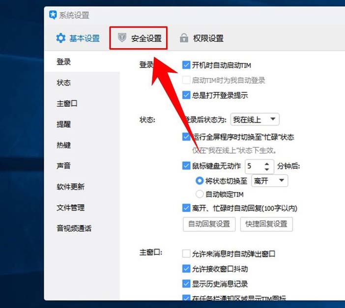 3、进入设置界面后,在窗口的最上方可以看到有基本设置、安全设置和权限设置三个选项,点击【安全设置】选项。