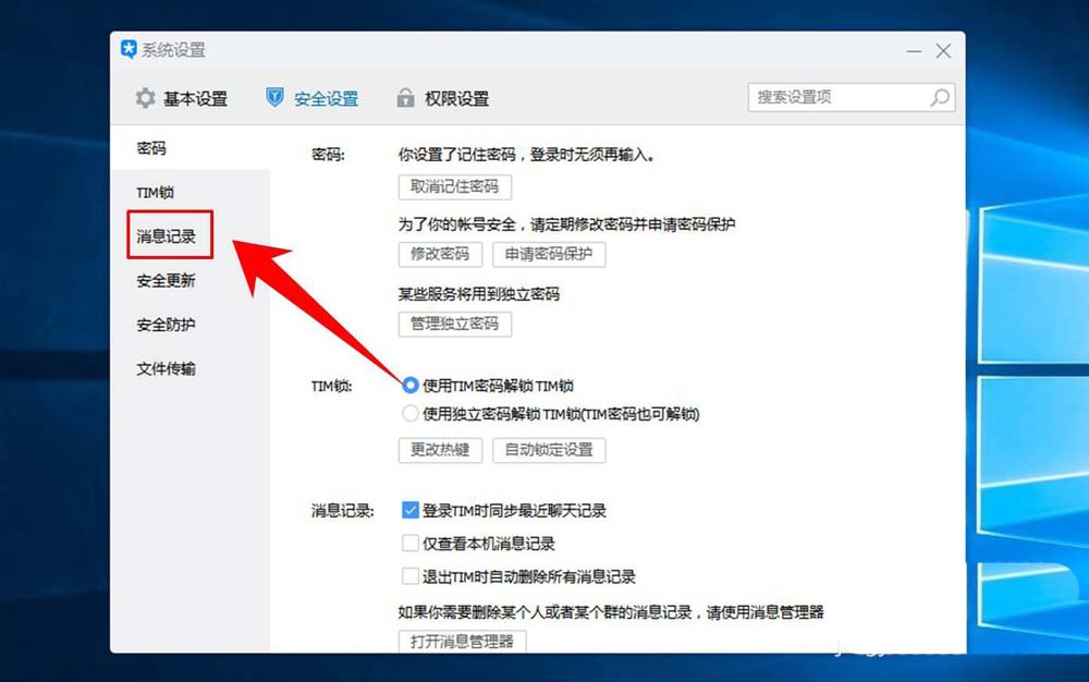 5、点击“消息记录”选项后,在其右侧窗口图示位置勾选【登录TIM时同步最近聊天记录】,这样就能同步成功了。