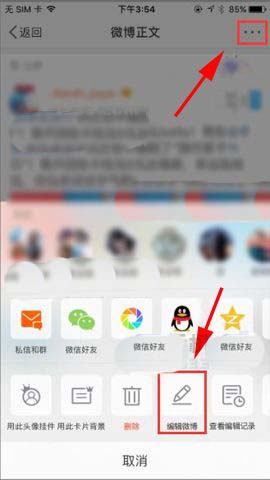 1)打开手机微博点击进入要修改的那条【微博】,进入到微博正文后点击右上角的按钮进入到功能菜单后点击【编辑微博】选项。(如下图)