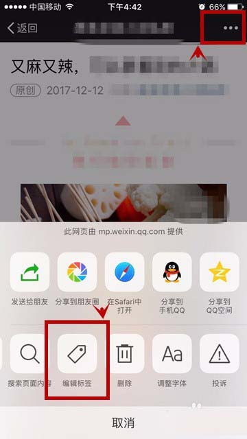 5、进入内容页面后,点击右上角的“...”菜单按钮,并在弹出的菜单中,找到并点击“编辑标签”。
