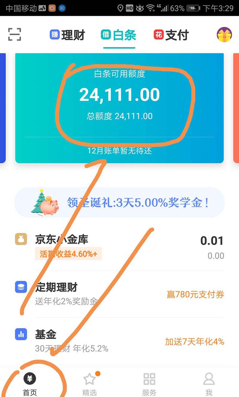 2、进入京东金融主界面之后,点按界面下方的首页标志,然后点上方箭头指向的白条可用额度标志。