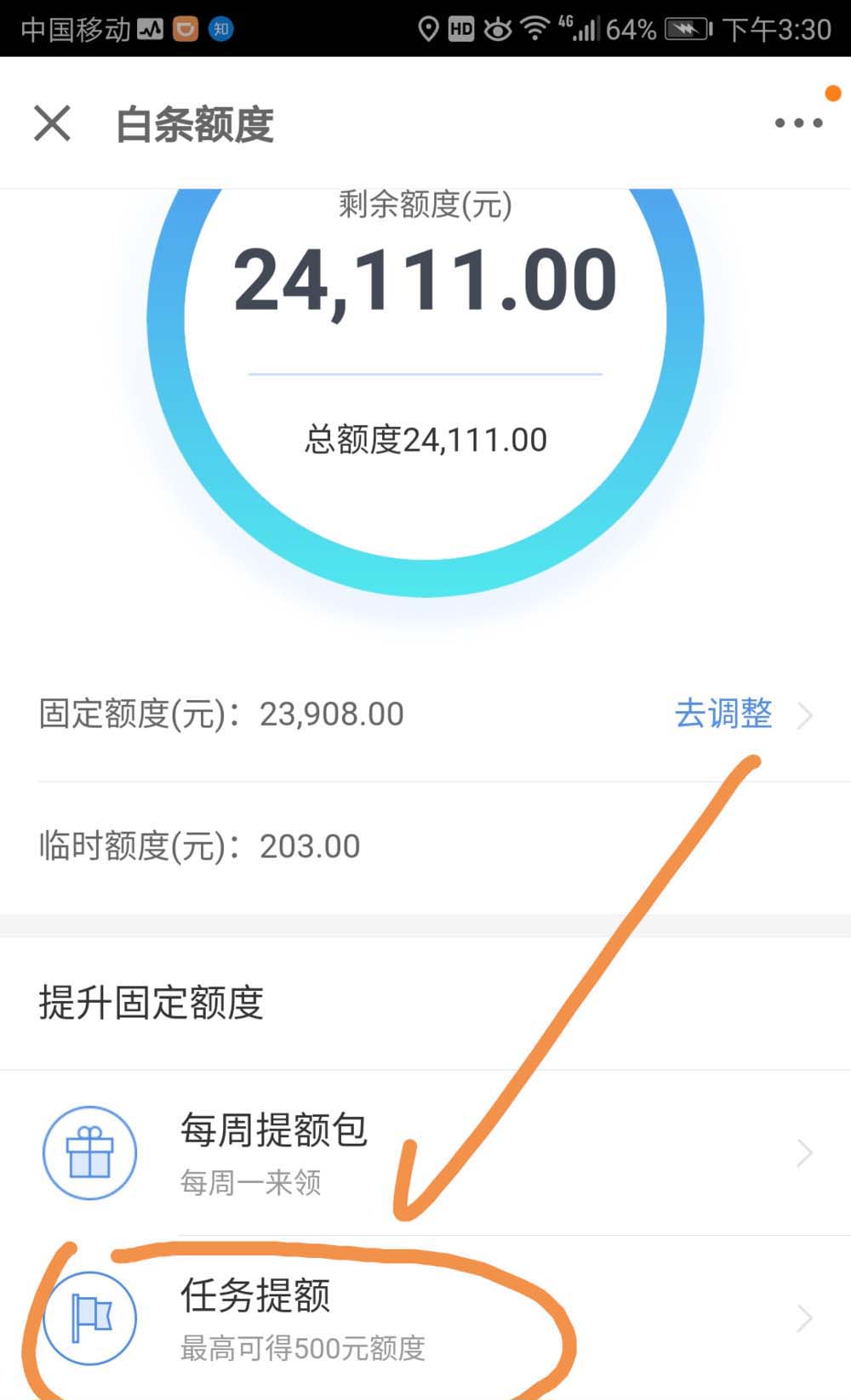 4、界面转入白条额度界面,点按界面下方的任务提额标志。