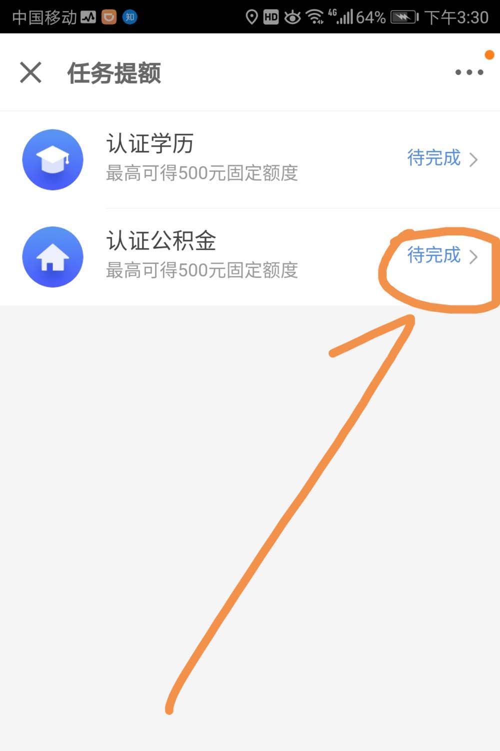 6、进入任务提额界面之后,点按认证公积金后面的待完成标志。