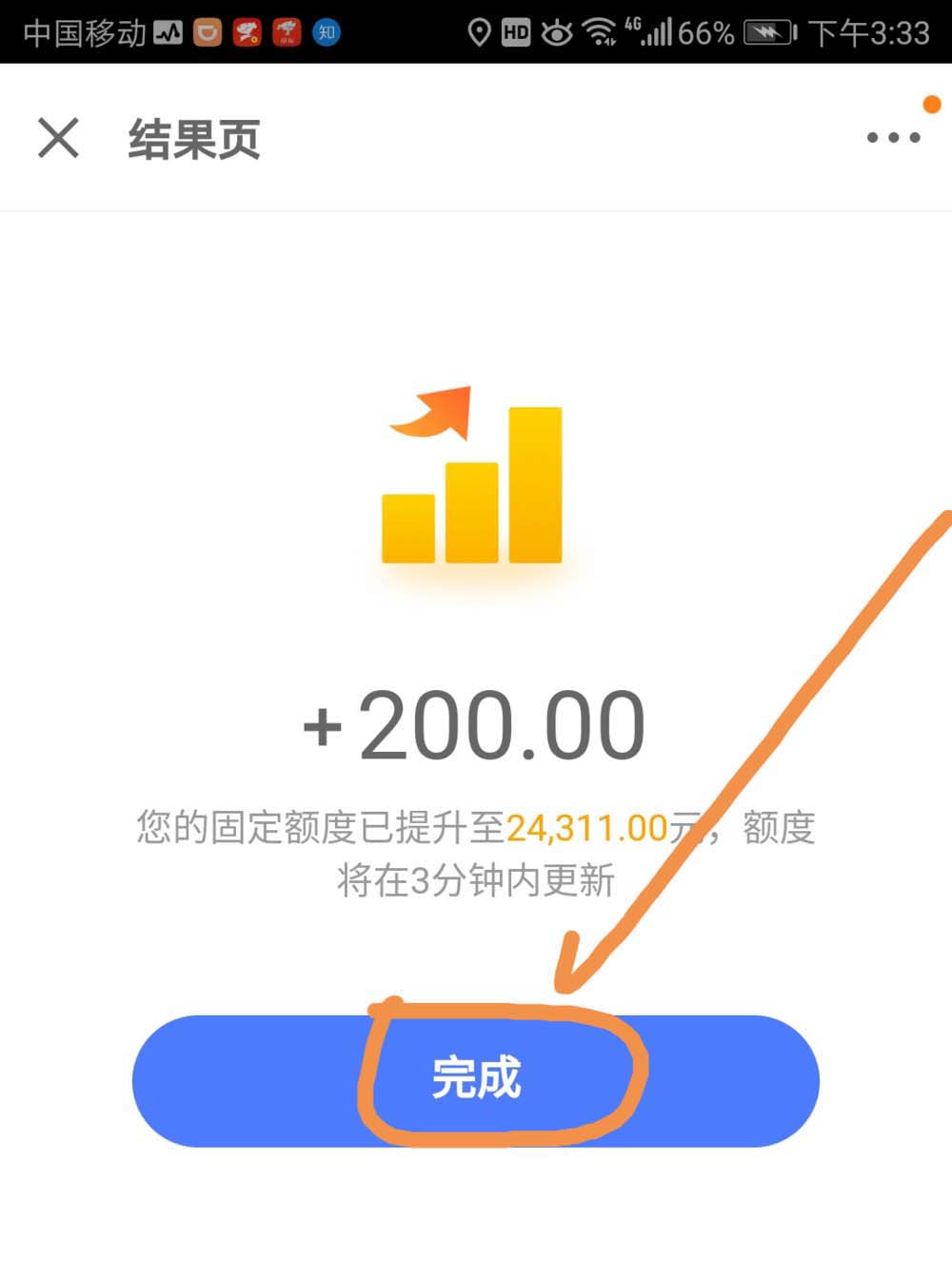 8、界面出现提示,提示提额完成的金额,点按完成即可。