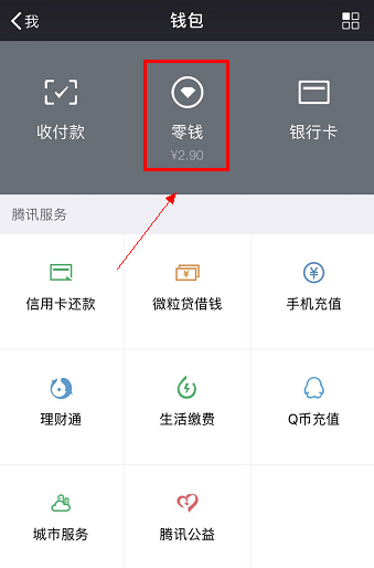 4、在零钱界面点击零钱通小篮字的链接,如下图所示