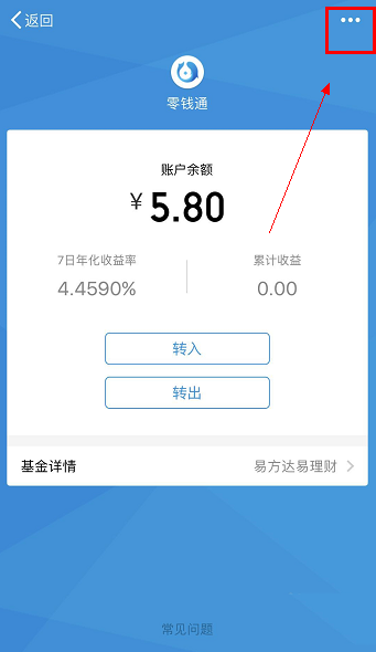 5、在零钱通界面点击右上角的三个白点,如下图所示
