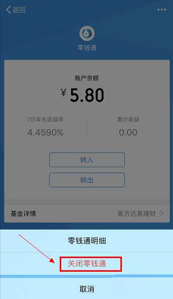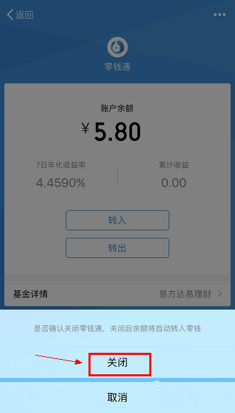 7、系统提示关闭后,零钱通的钱自动转入零钱,如下图所示,点击关闭选项。