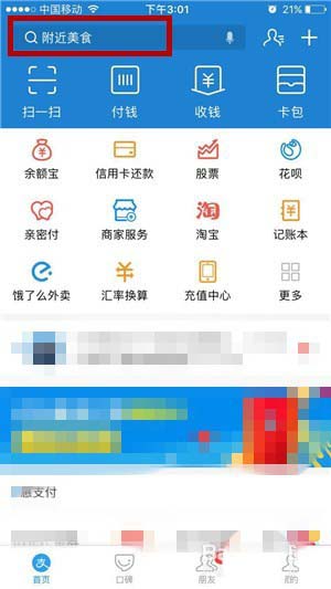 2、在支付宝首页面中,点击页面顶端的搜索栏。