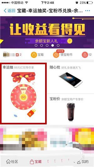 5、跳转页面后,便进入到了“余额宝生活号”的宝藏页面。然后我们点击“幸运抽”。