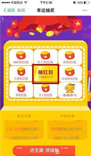6、进入页面后,点击“抽红包”按钮就可以进行抽奖了。每次抽奖都扣除10宝粉币。