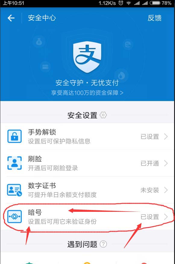 3、在弹出的安全中心设置页面上,可以看到安全设置的字样,有四种安全验证方法,暗号验证在最后,如下图红色框框所示,点击“暗号”设置功能,进入暗号设置界面