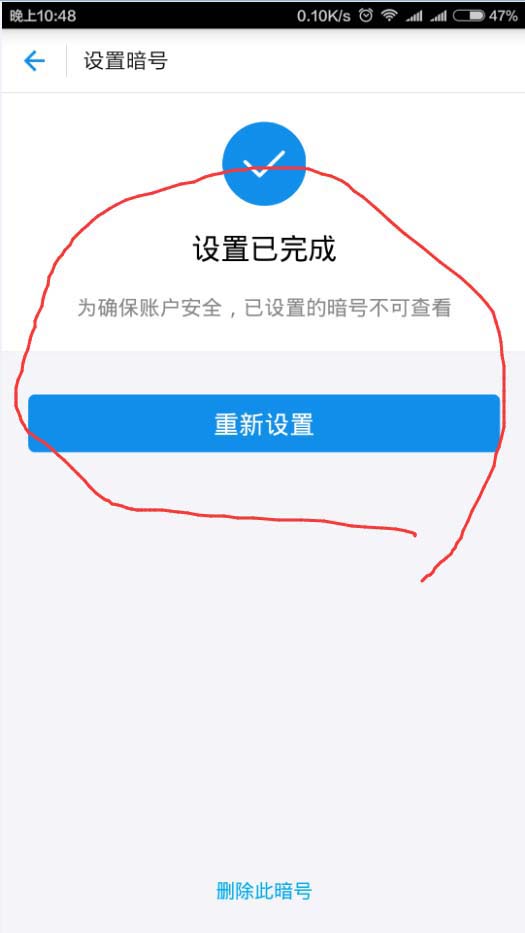 5、在弹出的暗号设置界面上,如下图所示,直接点击重新设置,按提示步骤拍照或者画图设置即可