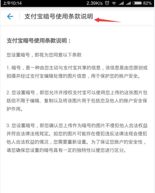 7、另外,关于暗号验证的一些声明条款,也要看看,用作暗号的图片,是会上传到服务器保存,不要拍下自己或者容易识别到你的图片或者画的图不要有自己的名字等明显的文字信息,详细的暗号验证使用服务条款参考下图2所示
