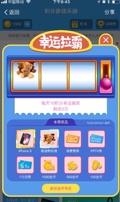 3、幸运拉霸,也是抽奖的一种,有点类似小时候的游戏机,主要用来赚取金币,金币可以兑换各种实物奖励。