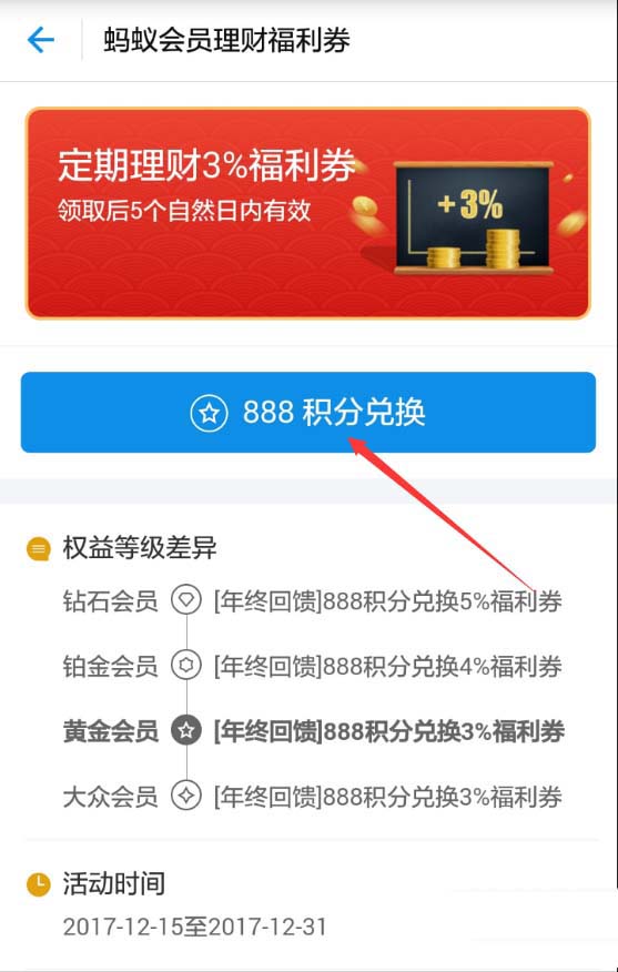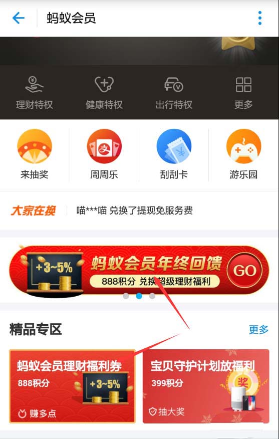 4、进入蚂蚁会员理财福利券兑换界面,直接点击【888积分兑换】,如下图所示。