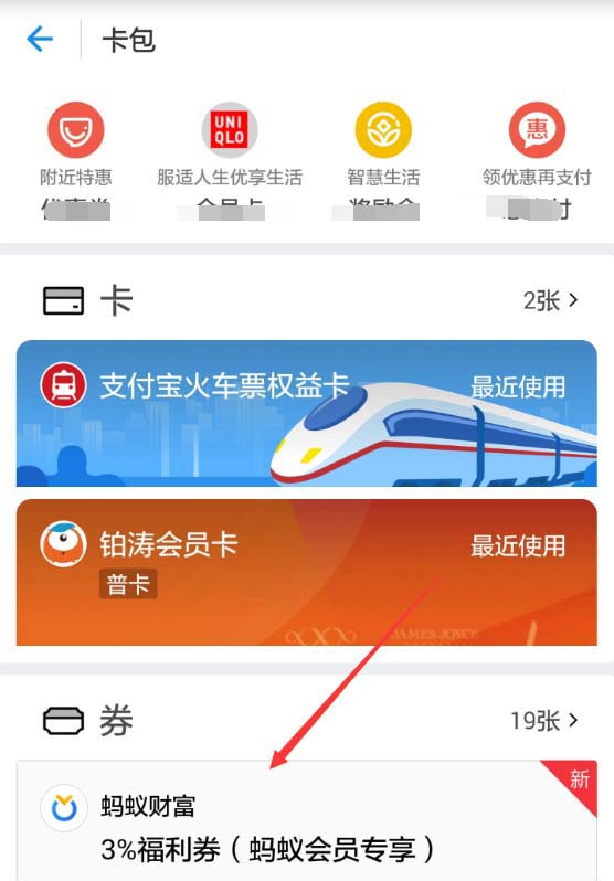 7、然后在支付宝的卡包里就可以看到刚才兑换成功的蚂蚁会员理财福利券,如下图所示。