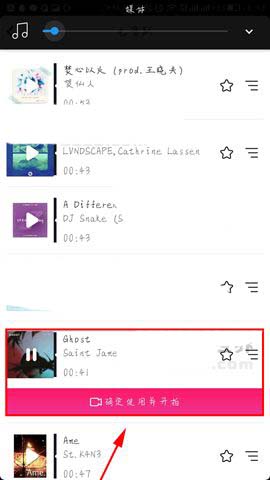 1)打开抖音短视频应用点击【+】进行视频录制,然后找到喜欢的背景音乐点击【确定使用并开拍】按钮。(如下图)