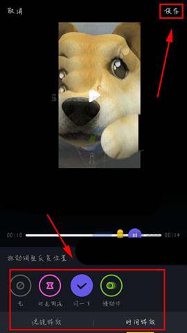 4)点击下面添加完特效后点击保存就会将视频保存到相册中了,背景BGM建议大家可以Kattrina这首歌曲,以上就是神烦狗特效的玩法了,大家可以根据自己的奇思妙想进行录制。(如下图)