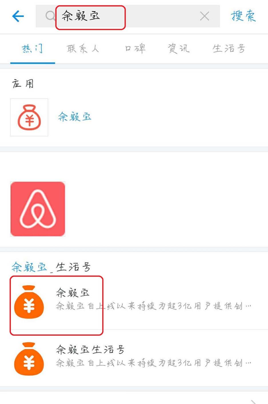 2、然后在顶部的搜索中输入“余额宝”,点击下面出现的余额宝生活号(如图);