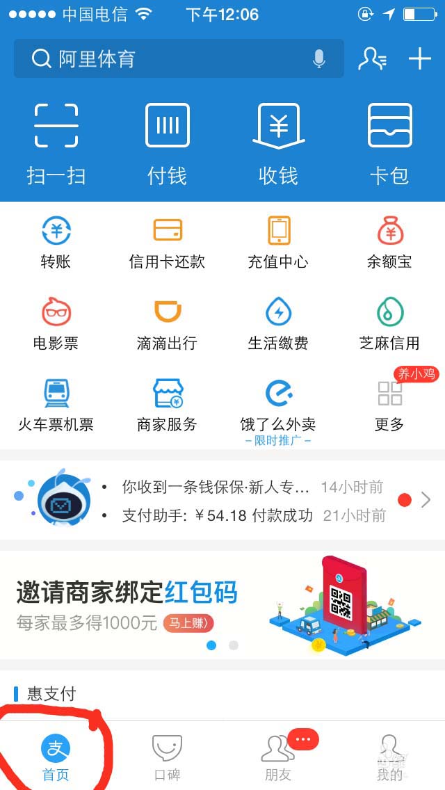 2、切换到支付宝首页。