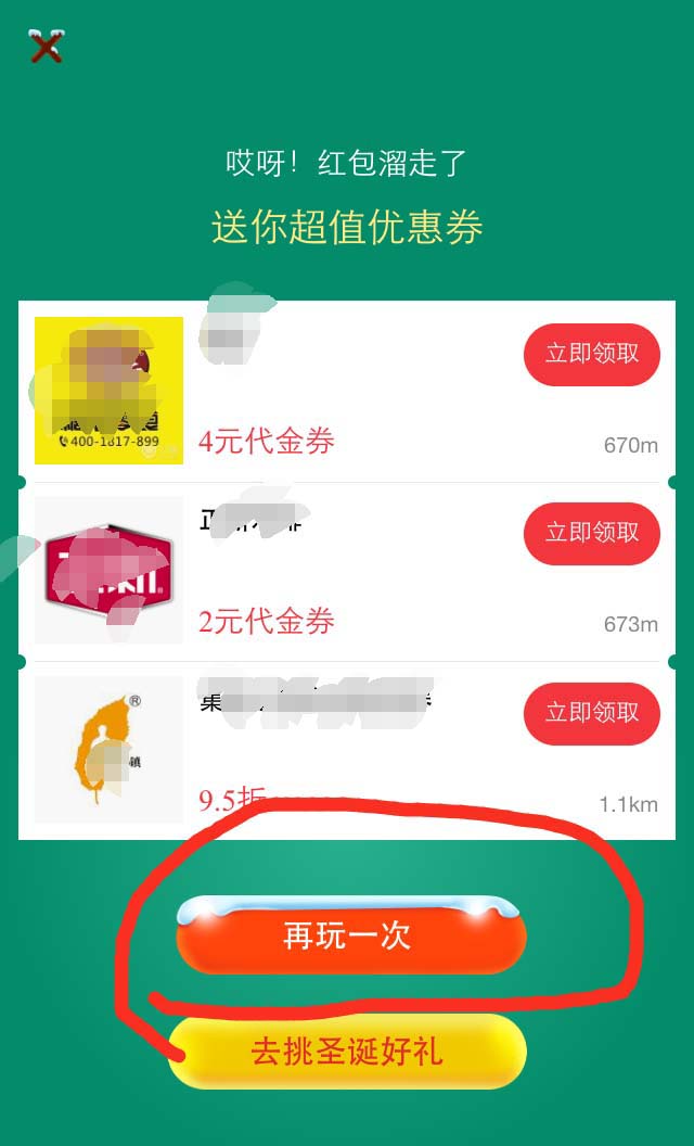 6、点中三次后,会出现三个圣诞袜子的界面,随机选一个。如果没有红包,就会出现一些优惠券。