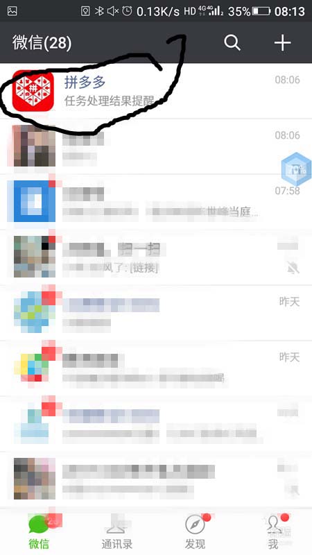 1、如图所示,在我的拼多多APP里面直接打开是找不到拼单卡收藏馆,所以现在告诉大家,一般我们的拼多多都是绑定了微信号的,所以我们要在微信里面找到拼多多的公众号。