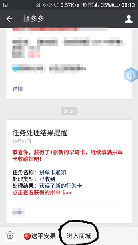 2、打开微信看到我们的拼多多小程序,一般来说拼多多的所有收到的信息都会在这里显示的,所以我们打开拼多多公众号,打开以后可以看到我已经获得了一张拼单卡,你可以直接点击消息进入详情,也可以点击下面的进入商城,进入拼多多APP。