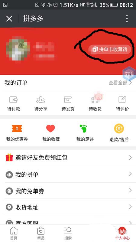 3、如图所示,从微信的小程序里面进入拼多多APP以后看到我的主页里面,在我的头像的左边有一个拼单卡收藏馆,点击进去进入下一步。